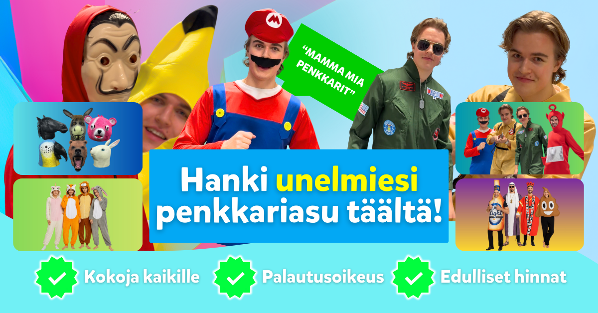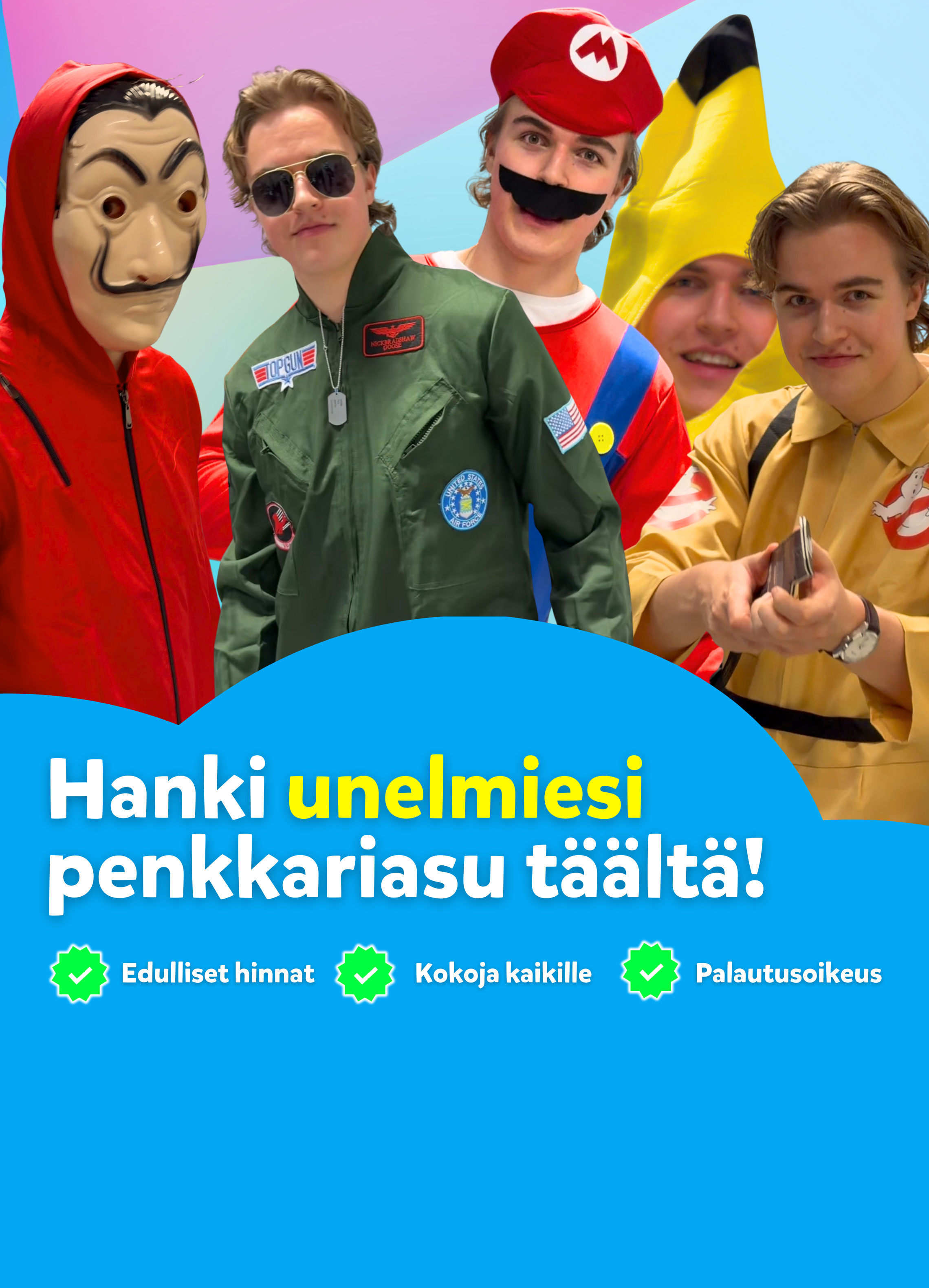 Ennakkotilaamalla varmistat, että saat juuri sen penkkariasun jonka haluat – ilman riskiä, että se myydään loppuun. Toimitamme kaikki ennakkotilaukset ajoissa ennen penkkareita ilmaisella toimituksella ja alennettuun hintaan. Kaikilla tilauksilla on aina palautus- ja vaihto-oikeus, joten voit tilata täysin huoletta.