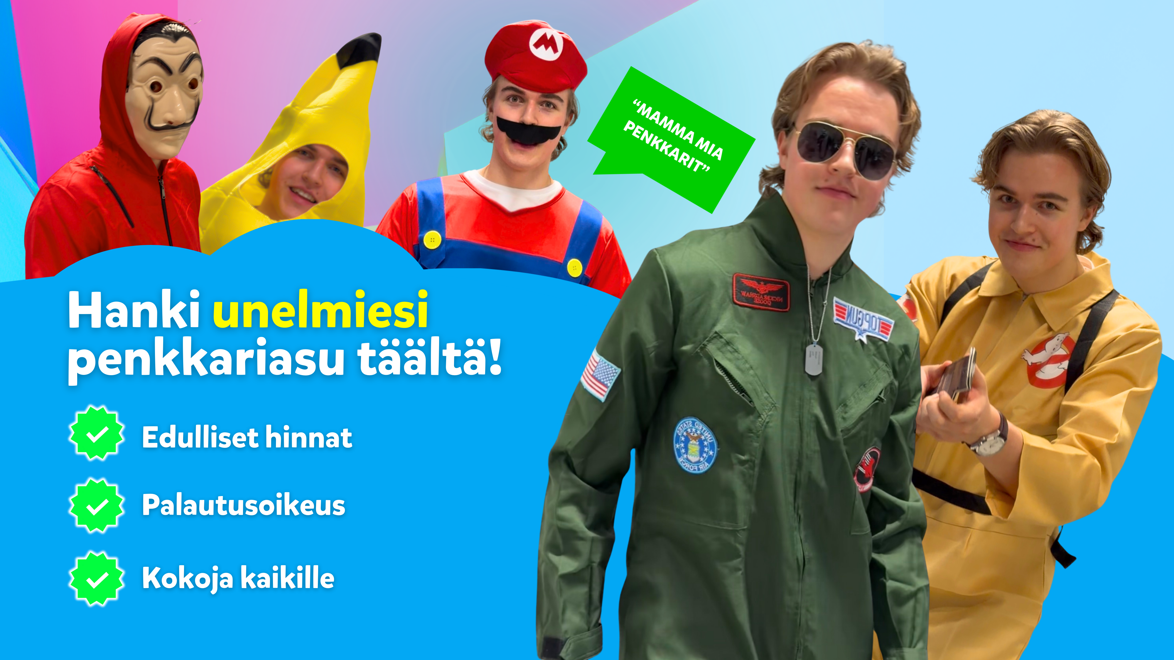 Tarjoamme valikoituja penkkariasuja nuorille, ennakkotilausmahdollisuuden, kohtuulliset hinnat ja varmat toimitukset ennen penkkareita.