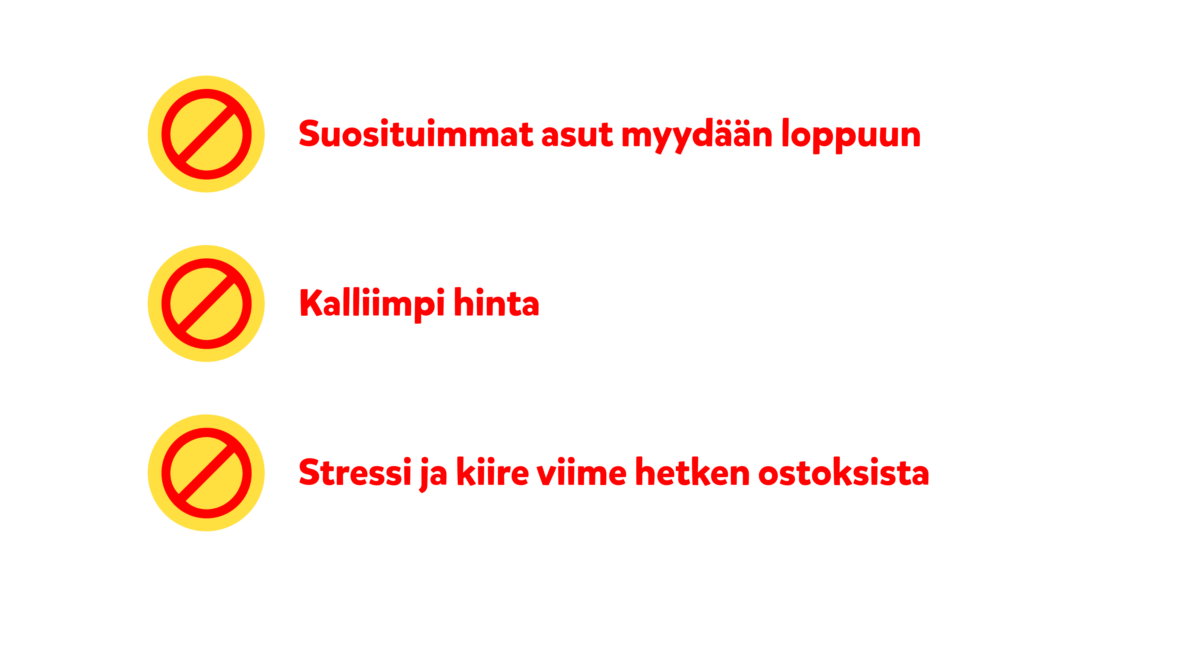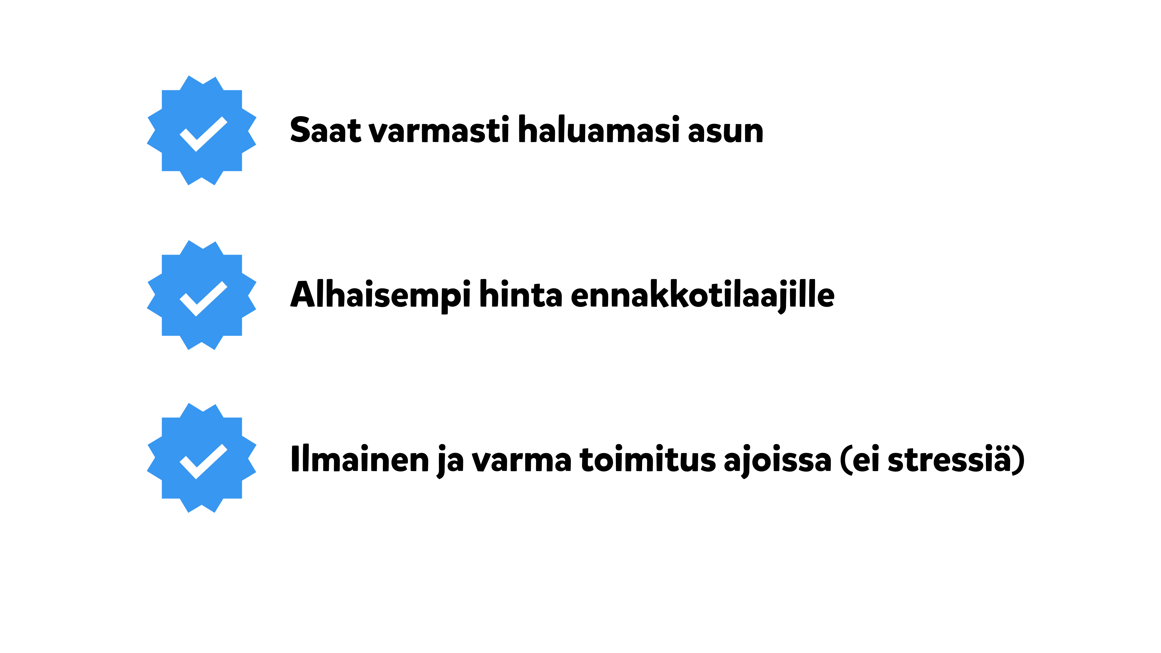 Ennakkotilaamalla varmistat, että saat asun. Jos et ennakkotilaa, suosituimmat mallit voivat loppua.
